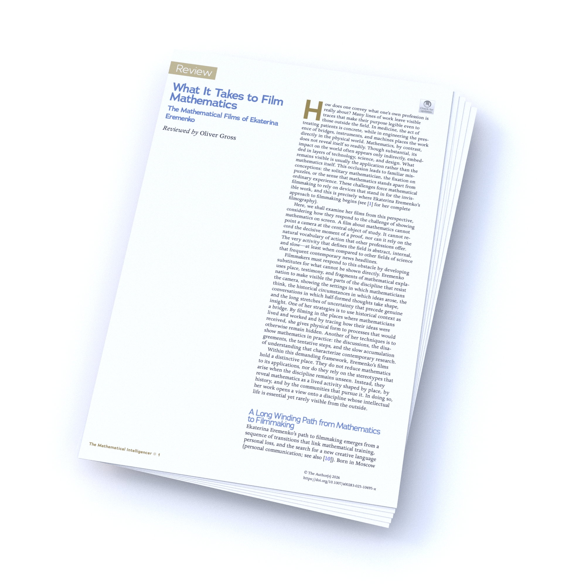 | What It Takes to Film Mathematics Oliver Gross The Mathematical Intelligencer (2026): 1-7. DOI: 10.1007/s00283-025-10495-x [PDF] |